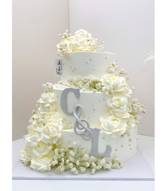 Mẫu Bánh Kem cưới tone trắng mix hoa cưới cao cấp 2 tầng