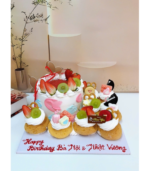 Một trong những mẫu bánh nổi bật nhất của tuần là bánh trái cây kết hợp su dài. Cách bài trí gồm cốt bánh chính ở trung tâm và vòng su dài bao quanh tạo nên kiểu dáng đẹp mắt, sang trọng và cực kỳ phù hợp cho các buổi tiệc đông người.