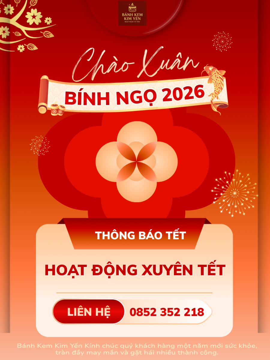 Nhằm đáp ứng nhu cầu ngày càng cao của khách hàng trong dịp Tết, Bánh Kem Kim Yến trân trọng thông báo lịch bán xuyên Tết Nguyên Đán 2026, tiếp tục phục vụ khách hàng trong những ngày đầu năm mới với chất lượng và sự tận tâm không đổi.