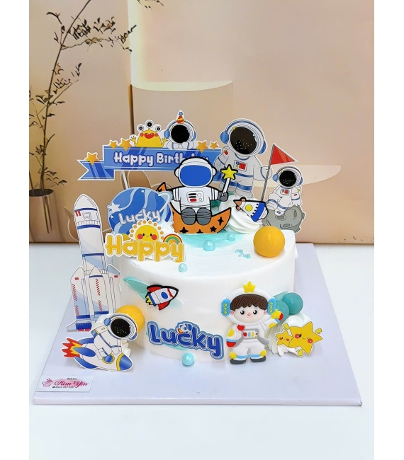 Chiếc bánh được phủ tone xanh đậm, điểm nhấn là các hành tinh, phi thuyền và mô hình astronaut cực kỳ sinh động.